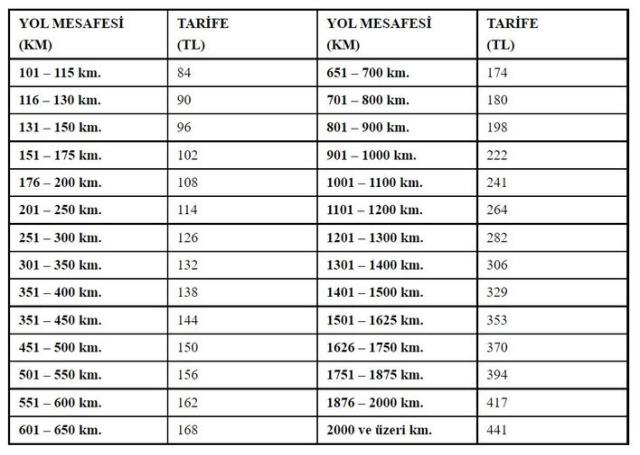 Yol mesafesi 101-115 kilometre arası olan seyahatlerde bilet fiyatı 84 lira üstü olamayacak. 351-450 kilometre arası yolculuklarda bilet fiyatı 144 lira, 651-700 kilometre arası ise 174 lira olacak.