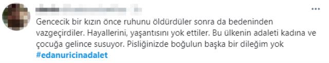 Yaşanan olayla ilgili pek çok sosyal medya kullanıcısı tepki gösterdi, “edanuricinadalet” etiketiyle yüzlerce tweet atıldı.