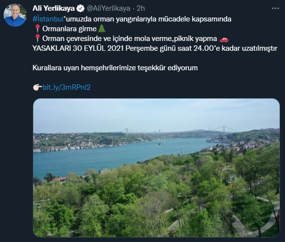 İstanbul Valisi Ali Yerlikaya, yaptığı açıklamada “İstanbul’umuzda orman yangınlarıyla mücadele kapsamında ormanlara girme, orman çevresinde ve içinde mola verme, piknik yapma yasakları 30 Eylül 2021 Perşembe günü saat 24.00’e kadar uzatılmıştır.” ifadelerini kullandı.