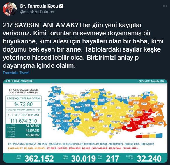 Sağlık Bakanı Fahrettin Koca, sosyal medya hesabından yaptığı paylaşımda, şunları kaydetti: