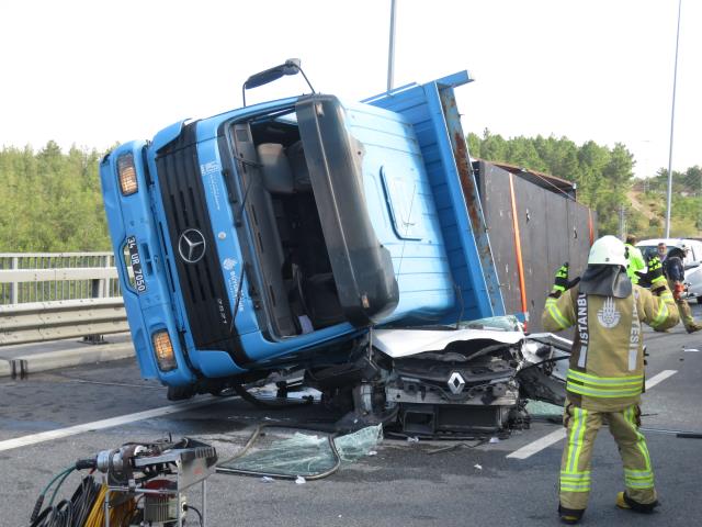 İstanbul Kuzey Marmara Otoyolu’nda beton blok taşıyan tır, seyir halindeki otomobilin üzerine devrildi. Tırın altında ezilen otomobildeki sürücü hayatını kaybetti.