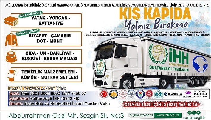 İHH’nın ‘Kış Kapıda Yalnız Bırakma’ kampanyası kapsamında Sultanbeyli İHH Temsilciliği de; Sultanbeyli Kaymakamlığı, Sultanbeyli Belediyesi, başta olmak üzere İlçe Milli Eğitim Müdürlüğü, İlçe Müftülüğü, muhtarlar, Sultanbeyli Eğitim Bir-Sen, SUGİAD, SUİŞKAD, Sultanbeyli Dernekler Platformu ve Sultanbeyli Kardeşlik Platformu ile protokol yaparak yaklaşık 25 ülkeye destek olmayı hedefliyor.
