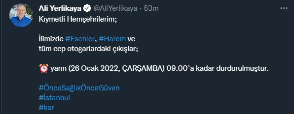 “Kıymetli hemşehrilerim; ilimizde #Esenler, Harem ve tüm cep otogarlardaki çıkışlar; yarın (26 Ocak Çarşamba) 09.00’a kadar durdurulmuştur.”