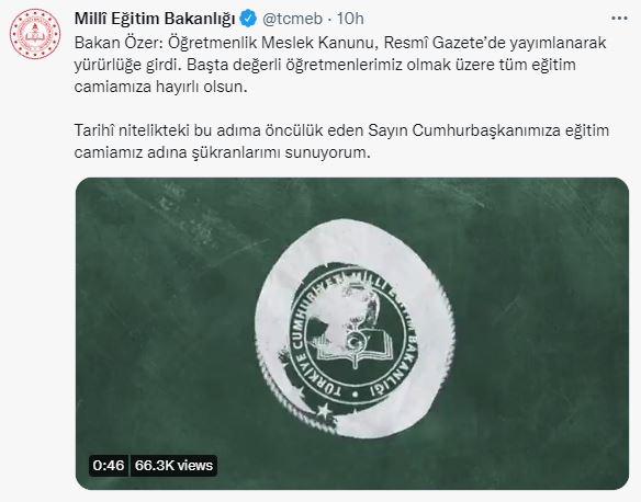 Milli Eğitim Bakanlığı’nın Twitter hesabında paylaşılan Bakan Özer’in açıklamasında şu ifadeler yer aldı: “Öğretmenlik Meslek Kanunu, Resmi Gazete’de yayımlanarak yürürlüğe girdi. Başta değerli öğretmenlerimiz olmak üzere tüm eğitim camiamıza hayırlı olsun. Tarihi nitelikteki bu adıma öncülük eden Sayın Cumhurbaşkanımıza eğitim camiamız adına şükranlarımı sunuyorum.”