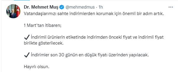 Ticaret Bakanı Mehmet Muş, Twitter hesabından yaptığı paylaşımda, düzenlemeye ilişkin bilgi verdi. Vatandaşları sahte indirimlerden korumak için önemli bir adım attıklarını belirten Muş, “1 Mart’tan itibaren indirimli ürünlerin etiketinde, indirimden önceki fiyat ve indirimli fiyat birlikte gösterilecek. İndirimler son 30 günün en düşük fiyatı üzerinden yapılacak.” ifadelerini kullandı.