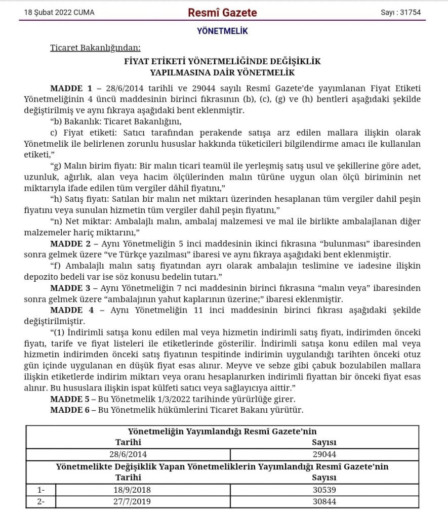 Vatandaşları sahte indirimlerden korumak amacıyla fiyat etiketi ve indirimli satış kriterleri yeniden belirlendi. Ticaret Bakanlığı tarafından hazırlanan “Fiyat Etiketi Yönetmeliği’nde Değişiklik Yapılmasına Dair Yönetmelik, Resmi Gazete’de yayımlandı.
