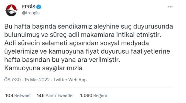 Bugün akşam saatlerinde yeni bir paylaşımda bulunan EPGİS, sendika aleyhine suç duyurusunda bulunulduğunu ve bu sebeple kamuoyuna fiyat duyurusu faaliyetlerine ara verildiğini duyurdu.