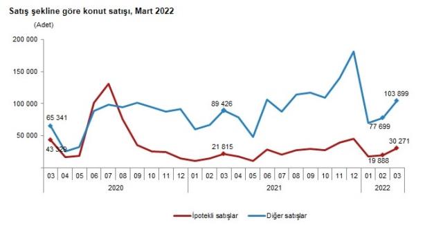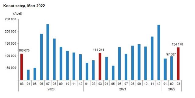 Türkiye genelinde konut satışları Mart ayında bir önceki yılın aynı ayına göre %20,6 artarak 134 bin 170 oldu. Konut satışlarında İstanbul 23 bin 974 konut satışı ve %17,9 ile en yüksek paya sahip oldu. Satış sayılarına göre İstanbul’u 12 bin 609 konut satışı ve %9,4 pay ile Ankara, 8 bin 51 konut satışı ve %6,0 pay ile İzmir izledi. Konut satış sayısının en az olduğu iller sırasıyla 25 konut ile Ardahan, 82 konut ile Bayburt ve 103 konut ile Tunceli oldu. Konut satışları Ocak-Mart döneminde bir önceki yılın aynı dönemine göre %21,7 artışla 320 bin 63 olarak gerçekleşti.