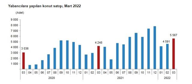 Türkiye İstatistik Kurumu, 2022 yılı mart ayı konut satış istatistiklerini açıkladı. Buna göre, Türkiye genelinde konut satışları mart ayında bir önceki yılın aynı ayına göre yüzde 20,6 artarak 134 bin 170 oldu. Geçtiğimiz ay Türkiye’den en çok konut alan yabancı ise 784 konutla yine İranlılar oldu.
