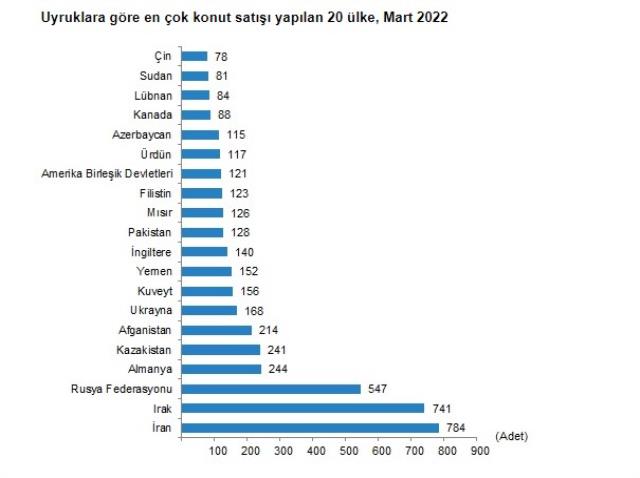 Mart ayında İran vatandaşları Türkiye’den 784 konut satın aldı. İran vatandaşlarını sırasıyla 741 konut ile Irak, 547 konut ile Rusya Federasyonu vatandaşları izledi.
