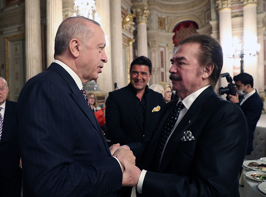 Erdoğan, ” Sanatçılarımız icra ettikleri sanat dalının ötesinde işte böyle büyük bir misyonun işte böyle önemli bir sorumluluğun sahibidirler. Esasen sanatçı toplumun aynasıdır. Toplumun birikimi, zevki, derdi, hayali sanatçısını biçimlendirir, yönlendirir. Türkiye bir dönemine damga vuran geçmişiyle bağlarını tümüyle kopartma anlayışının en büyük bedellerinden birini kültür ve sanat alanında ödemiştir. Közün üzerine ne kadar toprak atarsanız atın, maya sağlamsa içten içe yanmayı sürdürür. Milletimiz de sanatına, sanatçısına kültür ürünlerine sahip çıkarak kendi tarzını, kendi sentezini oluşturarak bu yıkıcı ve kurak dönemi aşmasını bilmiştir. Bu vesileyle müzik başta olmak üzere sanatın her alanında verdikleri eserlerle duayen sıfatını hak eden tüm sanatçılarımızı tazimle, rahmetle yad ediyoruz. Onlardan aldıkları bayrağı gururla taşıyan sanatçılarımıza başarılar diliyoruz” diye konuştu.