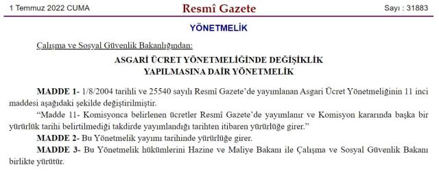 Cumhurbaşkanı Erdoğan’ın ara zam yapılması talimatı sonrası toplanan Asgari Ücret Tespit Komisyonu ikinci toplantısını gerçekleştirdi. Toplantının ardından belirlenen rakamı açıklaması için gözler Cumhurbaşkanı Erdoğan’a çevrilmişken Resmi Gazete’ de Asgari Ücret Yönetmeliği ile ilgili karar yayımlandı.