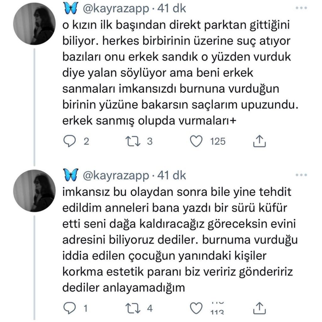 ‘Seni dağa kaldıracağız göreceksin evini adresini biliyoruz’ dediler. Burnuma vurduğu iddia edilen çocuğun yanındaki kişiler ‘Korkma estetik paranı biz veririz, göndeririz’ dediler anlayamadığım şey bir kıza nasıl el kaldırabilme cüretinde bulunabiliyorsunuz. Savunmasız bir kıza nasıl saldırabilirsiniz.” ifadelerinde bulundu.
