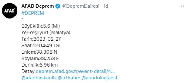 AFAD, bugün saat 12.04’te merkez üssü Yeşilyurt olan 5.6 büyüklüğünde bir deprem meydana geldiği duyurdu. Depremin derinliği 6.96 km olarak açıklanırken sarsıntı çevredeki illerden de hissedildi.