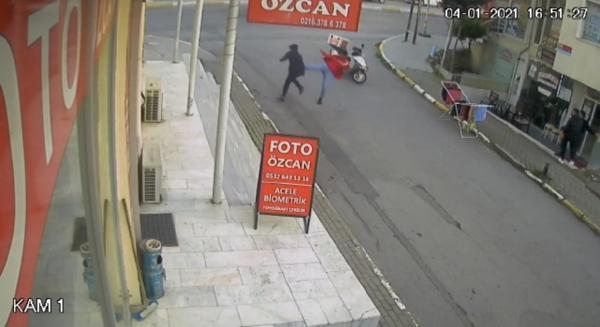 Pendik’te kuyumcuya sahte altın vermek isteyen kişi kaçarken önüne çıkan motosikletli kuryeden uçan tekme yedi. Şahsın uçan tekme yediği anlar güvenlik kamerasına yansıdı. Kurtköy’de bir şahıs elindek...